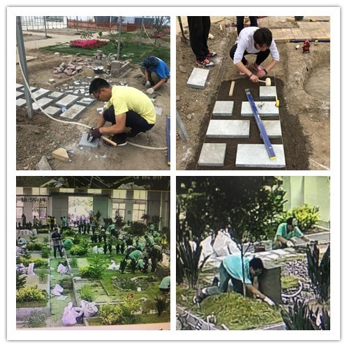 此项比赛共分为两部分,园林设计及园林施工。比赛时间是从5月22日全天至23日上午,在这一天半的时间里,4位选手发扬了不怕苦不怕累的专业精神,能吃苦、打硬仗,完成了2000平方米的庭院设计方案,以及一个20平方米的庭院景观施工作品。设计部分由两名设计队员于3个半小时内完成,设计并绘制出一套庭院设计方案,包括平面图、立面图、两幅效果图、鸟瞰图等。施工部分由两名施工队员于10.5小时内完成,包括三种道路铺装、景墙砌筑、水池营造、植物种植、水电连接等施工,集瓦工、木工、水电工于一身。此次赛项采用世界技能大赛的标准,平面误差不能超过3毫米,高度误差不能超过2毫米。在设计上追求创意创新,在施工上追求准确精致。学生们不仅要会园林设计,更要具备工匠精神,动手实际操作。比赛的时间跨度很大,同学们不断擦拭汗水,累到汗流浃背,累到跪着施工。最终,两个项目都全部完成并出色地发挥出了团队的最好水平。