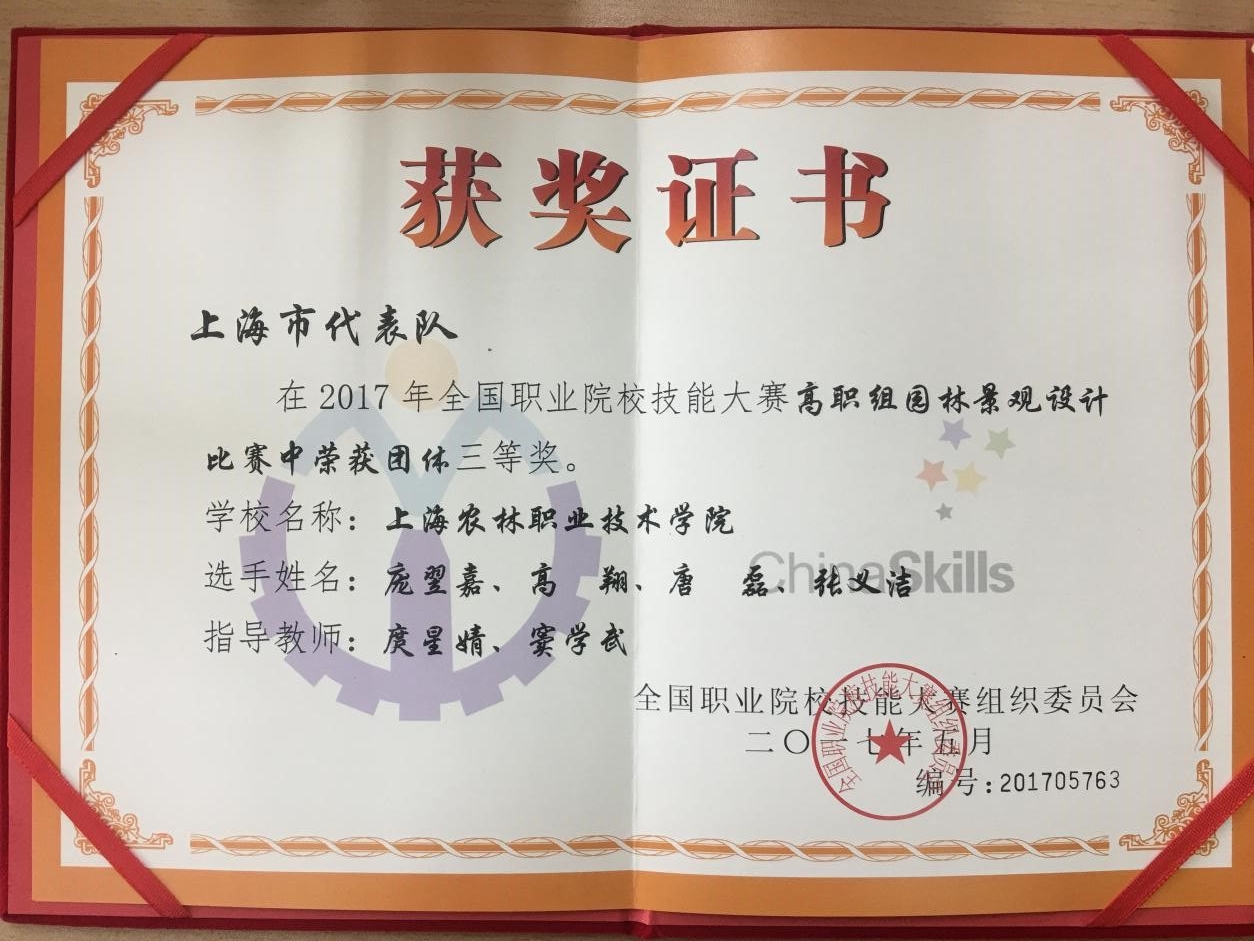 5月23日,2017年全国职业院校技能大赛高职组“园林景观设计”赛项在江苏农林职业技术学院闭幕,我院参赛队风景园林技术系四名选手庞翌嘉、高翔、唐磊、张义洁荣获团体三等奖。全国共有56支高职代表队参加比赛,我院作为领队学校,和上海济光职业技术学院共同代表上海队参赛。