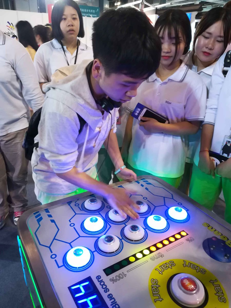 世博展览馆热闹非凡,除了比赛项目,还有19个展示体验项目。参观者动手可以走进高铁驾驶舱,可以体验智能穿戴设备,体验科技给生活带来的改变,还可以观看参与中华传统点心制作、旗袍盘扣制作等,感受带来未来科技与传统文化交映和碰撞。