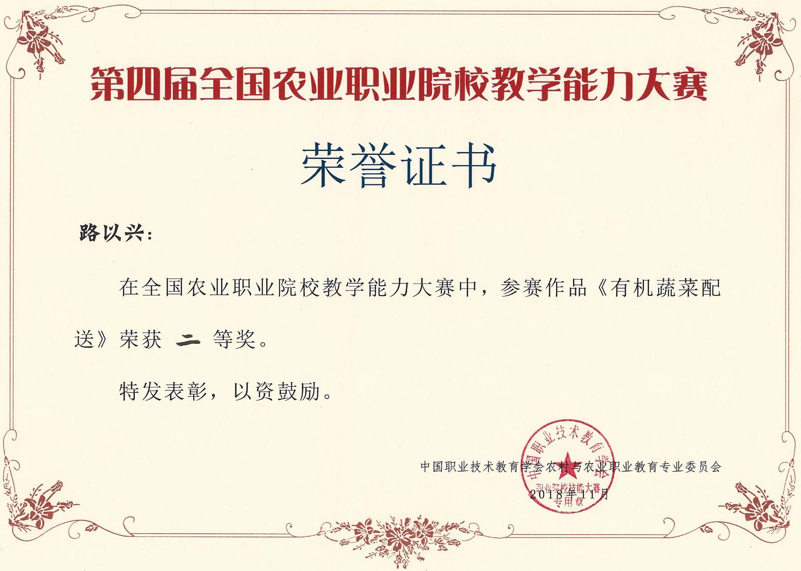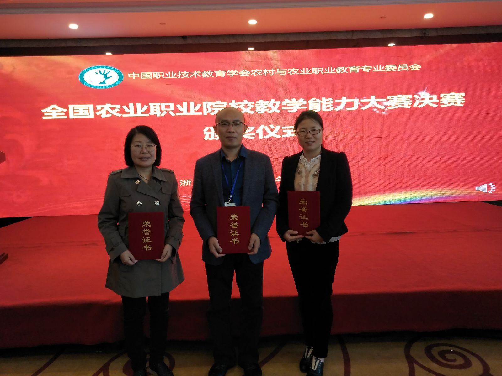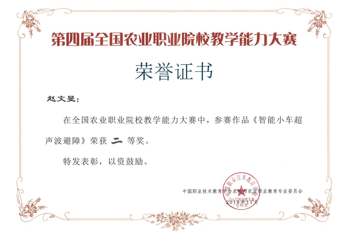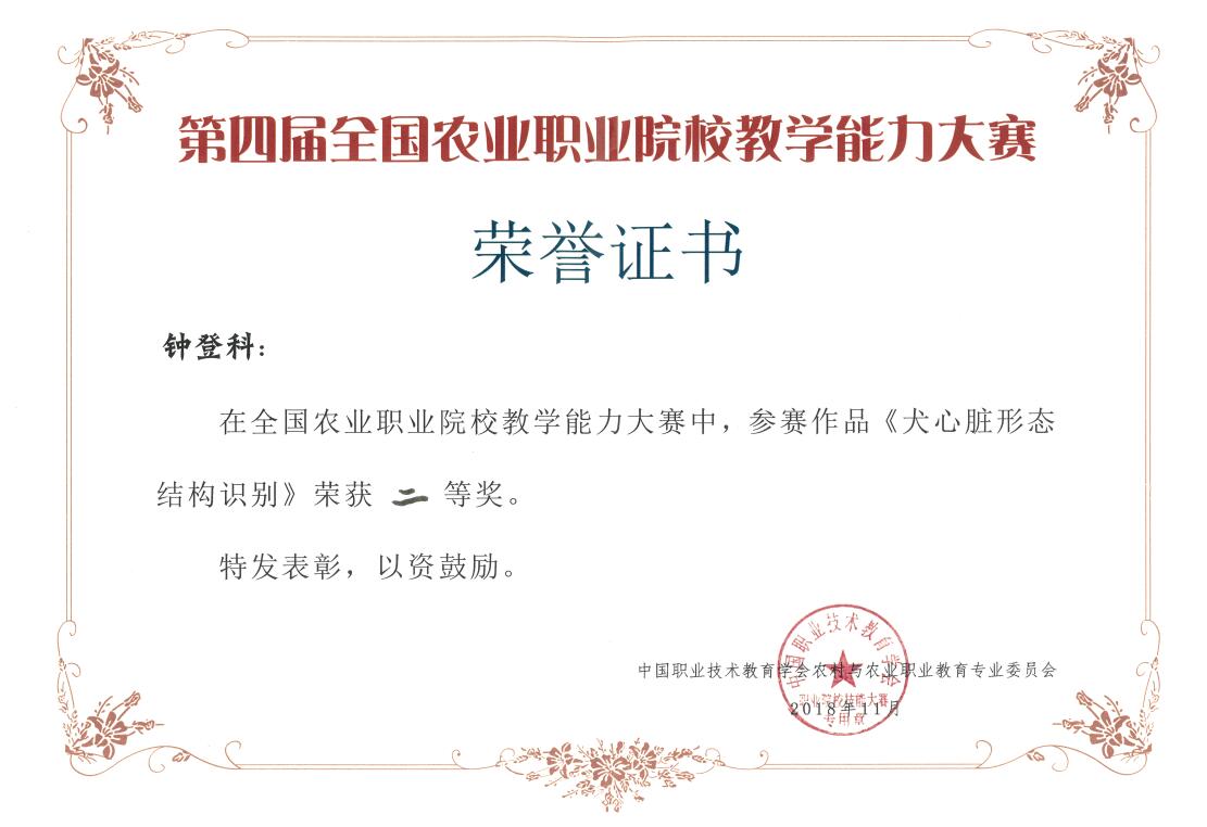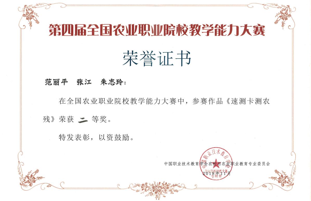 2018年10月31日至11月1日,第四届全国农业职业院校教学能力大赛决赛在嘉兴职业技术学院举办。学院动科系钟登科、农经系路以兴、农信系赵文旻和农生系范丽平代表的课程团队,分别荣获养殖组、农业经济组、机电加工组、和食品加工组二等奖。