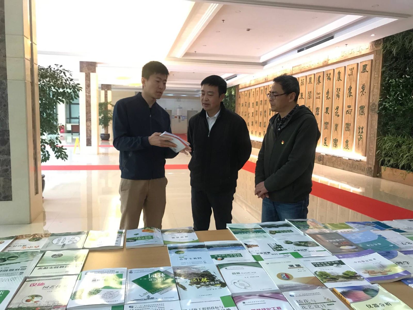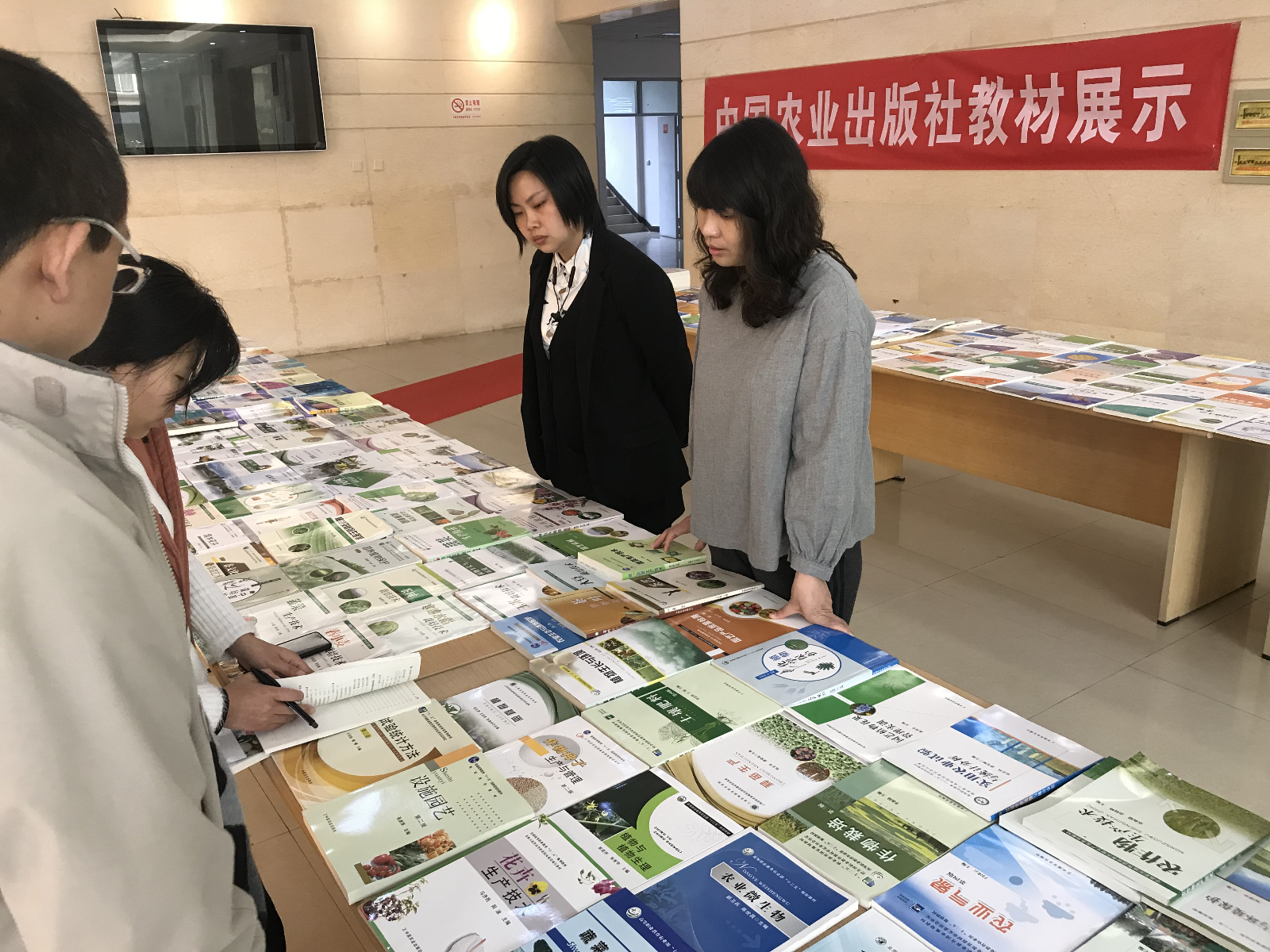 为了服务于学校人才培养,推进一流专业、精品课程建设,促进优秀教材进入课堂,同时更好地搭建校社合作的桥梁,中国农业出版社3月28日来我院开展教材展示和调研活动。教材展示及教师样书赠送活动在综合楼一楼大厅开展,学院积极组织师生参加书展活动,老师和同学们前往展览现场翻阅书籍、咨询交流,参加观展的教师获赠相关专业教材样书及最新教材目录。此次参展教材包括:公共基础类、植物生产类、动物生产类、风景园林类、资源环境类、食品类、生物类、机械电子及农业工程类、经济管理类、人文社科类、都市型现代农业类系列教材。