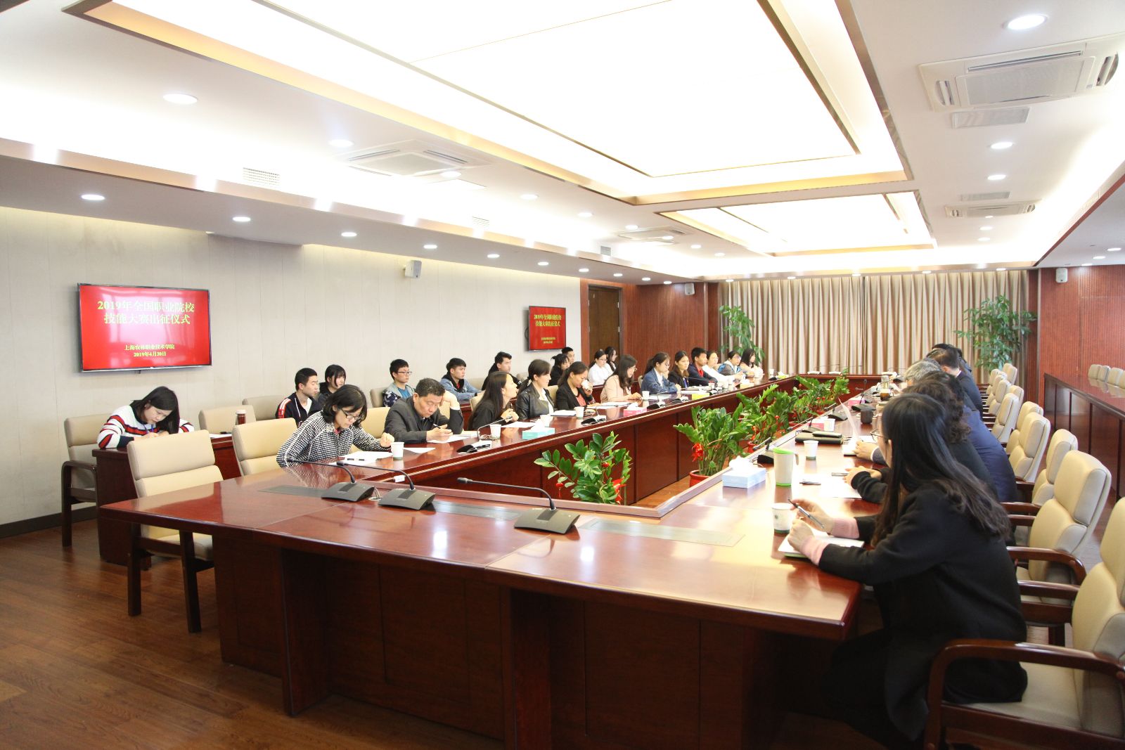 4月30日上午,在综合楼第一会议室,学院(校)举行2019年全国职业院校技能大赛出征仪式,党委书记蔡红、院(校)长魏华、副院(校)长谢锦平,教务处、参赛系部负责人及全体参赛师生参加会议。会议由魏华主持。
