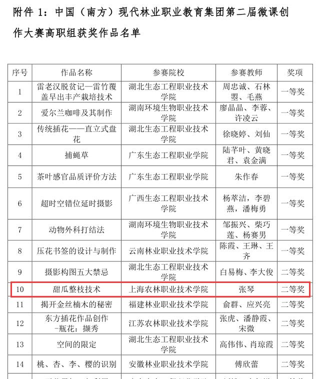 7月3日,从刚刚结束的中国(南方)现代林业职业教育集团第二届微课创作大赛上传来捷报:我院2名参赛教师获奖,分别为张琴老师的《甜瓜整枝技术》荣获高职组二等奖,王海丽老师的《认识农产品市场营销》荣获高职组三等奖。