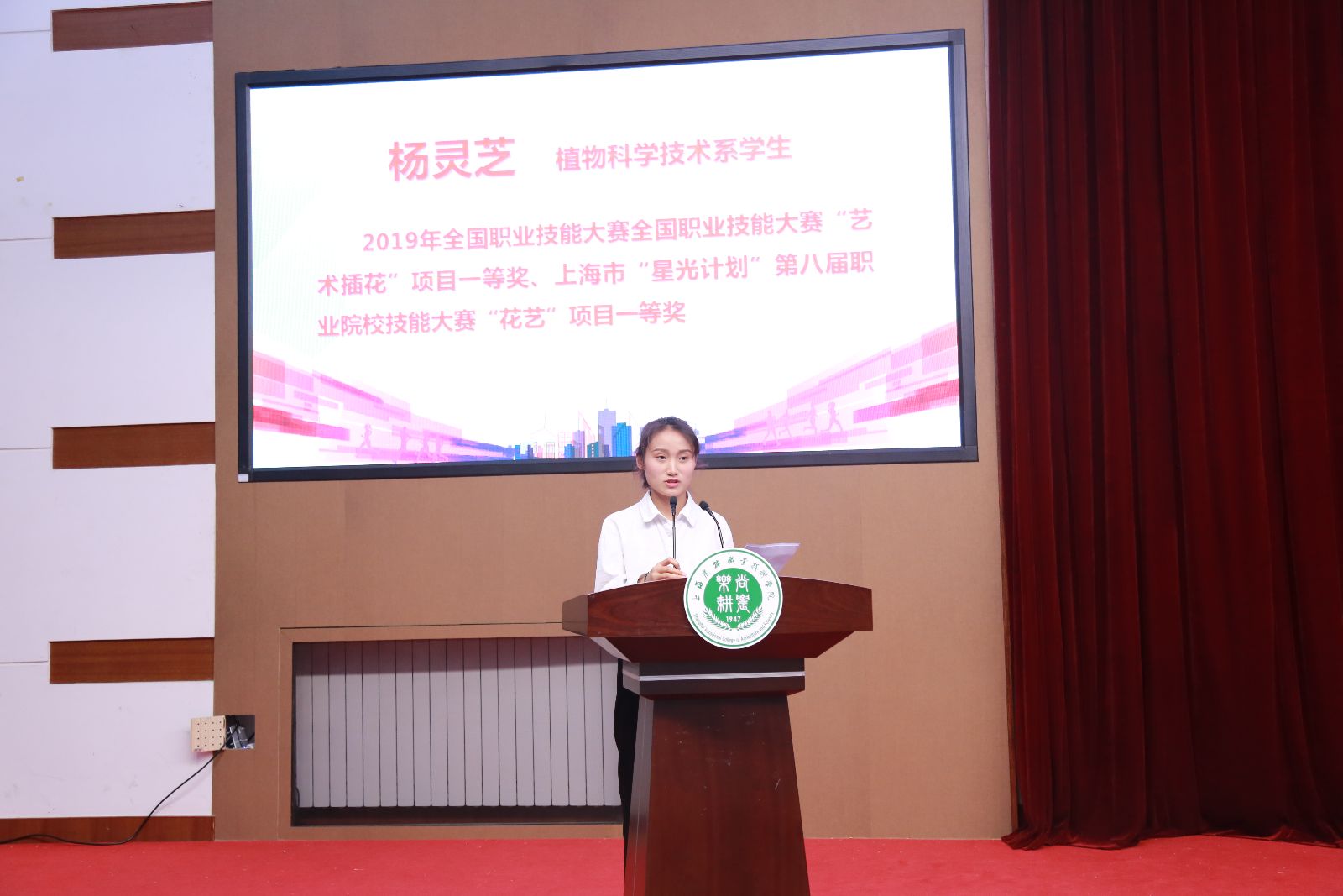 2019年全国职业技能大赛全国职业技能大赛“艺术插花”项目一等奖和上海市“星光计划”第八届职业院校技能大赛“花艺”项目二等奖获奖者杨灵芝、上海市“星光计划”第八届职业院校技能大赛“电子商务”项目一等奖获奖者沈心怡、第五届“互联网+”大学生创新创业大赛(上海赛区)金奖获奖者盖宁、上海市“星光计划”第八届职业院校技能大赛一等奖指导教师和“网站设计”项目(教师组)二等奖获奖者谭春茂分别代表获奖学生和指导老师发言,他们分享了自己和团队参加大赛的感悟和收获,并鼓励全校师生要继续以大赛为平台积极锻炼专业技能,实现综合素质的全面提升。