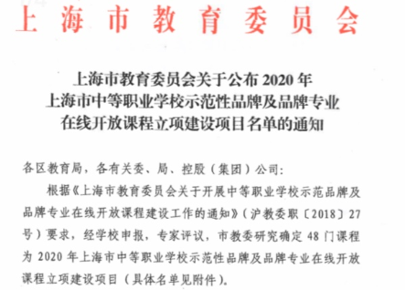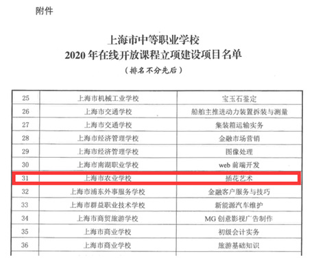 3月9日,上海市教育委员会关于公布2020年上海市中等职业学校示范性品牌及品牌专业在线开放课程立项建设项目名单的通知,我校徐卓颖老师的《插花艺术》获上海市中等职业学校2020年在线开放课程建设立项。