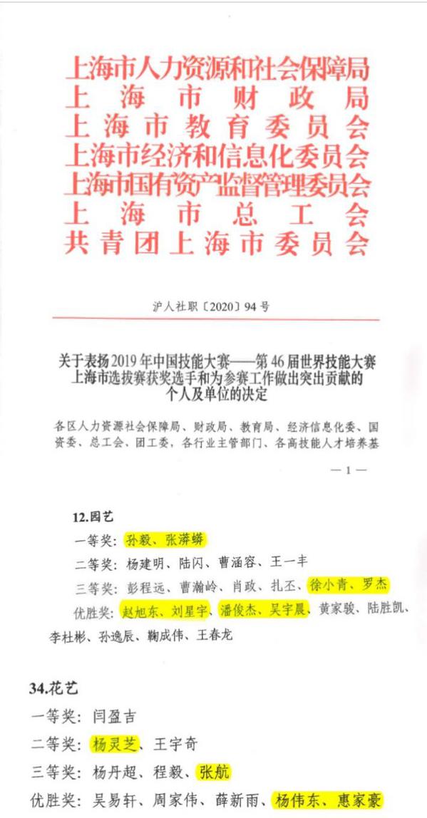 近日,上海市人力资源和社会保障局联合上海市教育委员会等多部门颁发《关于表扬2019年中国技能大赛——第46届世界技能大赛上海市选拔赛获奖选手和为参赛工作作出突出贡献的个人及单位的决定》,我院共14名师生获表彰。其中,园艺项目比赛中,学生孙毅、张漭蟒荣获一等奖,徐小青、罗杰荣获三等奖,赵旭东、刘星宇、潘俊杰、吴宇晨荣获优胜奖;花艺项目中,学生杨灵芝荣获二等奖,张航荣获三等奖,杨伟东、惠家豪荣获优胜奖。风景园林技术系沈丰老师荣获园艺项目“金牌指导教练”奖;植物科学技术系徐卓颖老师荣获花艺项目“优秀指导教练”奖。学院荣获“2019年中国技能大赛——第46届世界技能大赛上海市选拔赛”团体铜奖。