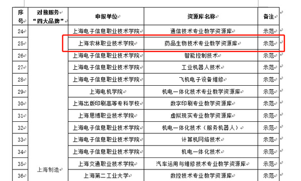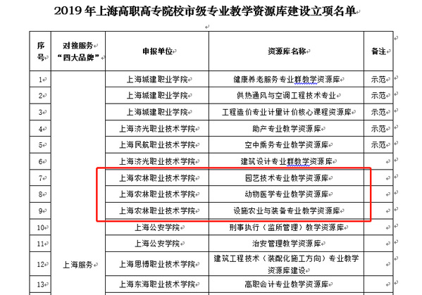 7月3日,上海市教育委员会关于公布2019年上海高职高专院校市级专业教学资源库建设立项名单的通知,学院四个专业获上海市级高职高专专业资源库建设立项,分别是园艺技术专业教学资源库、动物医学专业教学资源库、设施农业与装备专业教学资源库以及药品生物技术专业教学资源库。