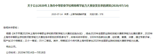 据悉,2020年上海市中等职业学校教师教学能力大赛由上海市教委教研室组织,比赛采取先网络初评后现场决赛的方式评审,初赛共46所中职校的100件参赛作品参赛,其中39所中职校的66件作品通过网络评选入围复赛,复赛于2020年7月5日在上海市商贸旅游学校举行,现场决赛评选出特等奖10个,一等奖21个,二等奖35个,获得特等奖的优秀作品将被上海市推荐参加全国职业院校中职组教师教学能力比赛。