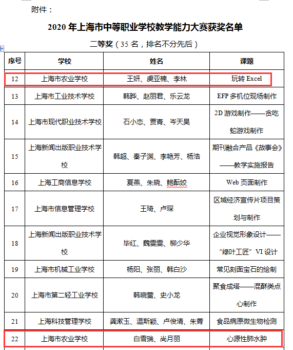 近日,上海市教委教研室公示了2020年上海市中等职业学校教师教学能力大赛获奖名单,我校公共基础课程组王妍、虞亚楠、李林教学团队的《玩转Excel》参赛作品,中职专业技能课程一组白雪瑞、尚月丽教学团队的《心源性肺水肿》参赛作品分别荣获二等奖。