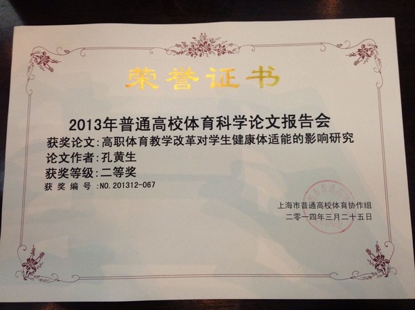 4月11日,上海市普通高等学校体育科学论文报告会暨上海市高校体育教学改革研讨会在华东政法大学举行,学院基础部孔黄生老师荣获本届体育科学论文评比的二等奖。