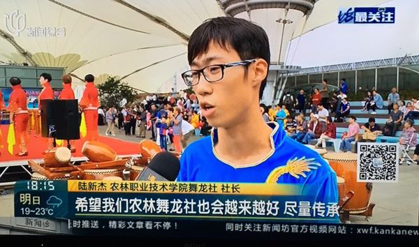 舞龙队带来的精彩表演《彩龙舞东方》赢得了在场观众的阵阵喝彩,而且受到了上海电视台新闻综合频道《新闻坊》的关注,舞龙社社长陆新杰还接受了栏目组记者专访。