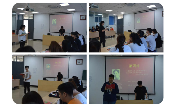 《红色家书》共有四个篇章——明志篇、正己篇、亲情篇和教子篇,活动开始,四位同学从这四个篇章中选取了各自印象最深刻的段落进行了诵读。