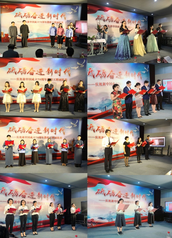 为迎接中华人民共和国成立70周年,讴歌新中国成立70年所取得的巨大成就,进一步激发学院广大教职员工的爱国之情、报国之志和创新创造活力,5月31日,学院工会在学院综合楼303数字资源放映厅举办“砥砺奋进新时代”庆祝新中国成立70周年学院教职工朗诵比赛。朗诵比赛由学院党委副书记俞锦禄、宣传处处长樊清誉、离退休第一党支部书记魏学东、离退休第二党支部书记杨绵芳、团委书记胡慧春担任评委。党委书记蔡红出席活动并致辞。