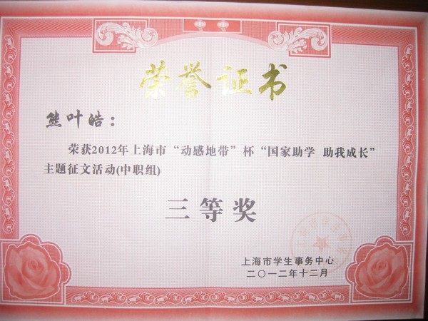 近日,为贯彻落实教育部全国学生资助管理中心《关于开展“国家资助、助我成长”主题征文活动的通知》(教助中心[2012]45号)文件精神,深入宣传贯彻党和国家资助家庭经济困难学生政策,加强对学生的励志感恩教育,全面展现家庭经济困难学生资助工作取得的巨大成就,学校组织学生参加由上海市教委学生事务中心组织的征文活动。园林111班熊叶浩同学获上海市教委学生事务中心(中职组)征文三等奖。