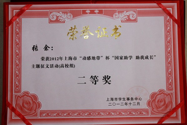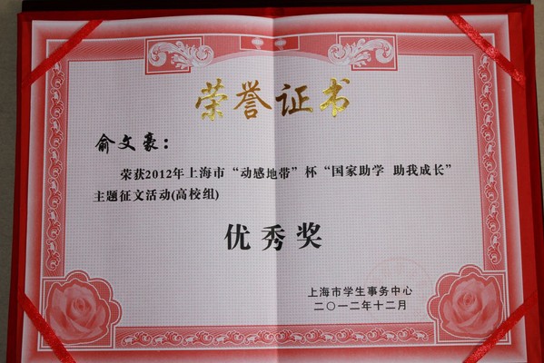 近日,上海市学生事务中心公布了全上海市高校组2012年“国家助学 助我成才”征文评选结果,我院报送的征文中,有2篇稿件分获二等奖和优秀奖,学院在此次征文活动组织工作中成绩突出,获优秀组织奖。