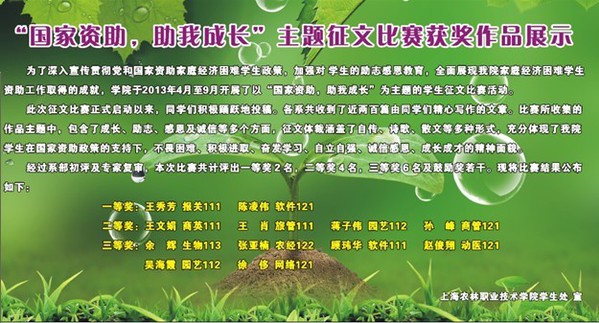 学院于今年4月至9月开展的以“国家资助助我成长”为主题的学生征文比赛活动日前圆满结束。本次征文比赛共计评出12篇优秀作品,其中7篇已推荐参加2013年度市教委主办的”国家资助 助我飞翔“资助征文比赛。