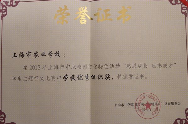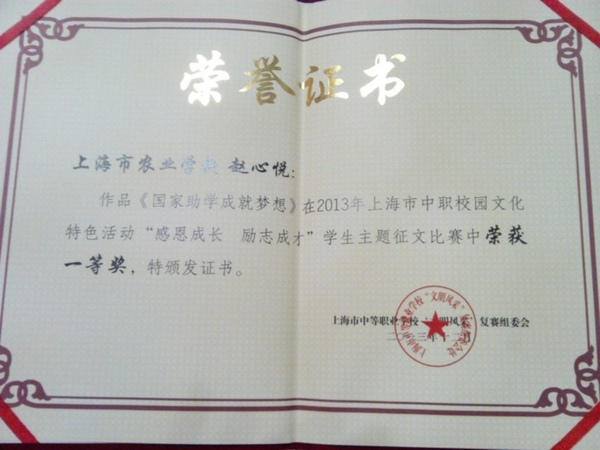 为弘扬感恩精神,提高当代中职学生回报社会的公益意识,上海市于去年12月举办了中职校园文化特色活动“感恩成长,励志成才”学生主题征文比赛。市农校园林111班赵心悦同学凭借《国家励学,成就梦想》一文,荣获一等奖。市农校在本次比赛中组织得当,荣获优秀组织奖。