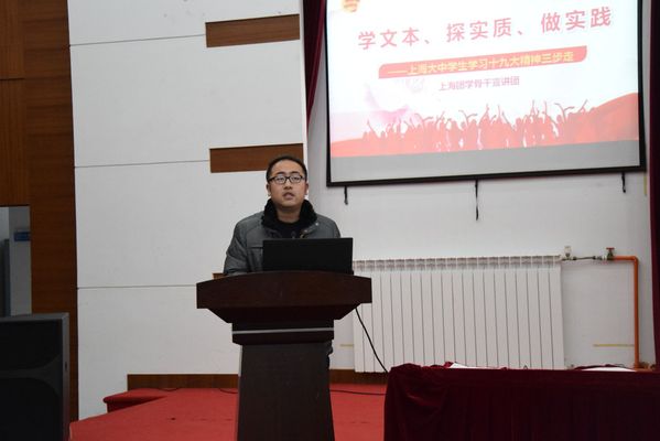 12月20日、25日、26日,学习贯彻党的十九大精神宣讲会在我院举行。上海外国语大学学生会李明炎、马振昊,上海青年讲师团成员、学院团委书记胡慧春,学生会秦雪珠、倪楠楠等4位上海团学骨干宣讲团成员,交流分享对党的十九大精神的学习与感悟。各系团总支书记、团学干部及广大团员青年共600余名师生聆听。