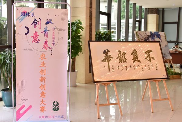 “创意青春”农业创新创意大赛活动为今年首次举办。活动旨在培养和提升农林学子的创造精神和创新意识,营造浓厚的创新创业氛围,激发学生学农爱农热情,发现、培育和选树农业创新人才。“创意青春”活动于今年4月面向全院(校)在校学生征集紧扣农业主题创新创意作品,共收到作品20余件,近百名学生参与。活动组委会先后经过海选、初赛、决赛等评选环节,最终展出“五谷丰登”“学农 爱农 尚农”“尚农书屋”“闲梦园”等10件创意作品。作品“五谷丰登”是一幅长1.2米,用红豆、小米、麦穗等7种杂粮粘结而成的农民秋收图;“学农、爱农、尚农”用红线勾勒花瓶形状、白线勾勒小篆等3种字体的“农”字,配以棉花、薰衣草和麦穗等7种农作物构成一组插花作品。本次活动中,最吸人眼球的当属展厅中的5件大型植物造景作品。大厅正中的一件长约8米的主景,由一棵枯树配以焕发生机的枝叶,展现蓬勃的生命力和强大的力量,体现学校的校训“生生不息”;主景正中遒劲雄浑的书法作品“桃李满天下”,寓意学校的耕耘事业,农林学子遍布“三农”各条战线。“Reborn”“交响之乐”“梦见梵高”和“Recover Space”均源自学生参加2018上海家庭园艺展的金奖、银奖作品,作品围绕环保主题,利用废旧的木桶、抽屉、乐器等配以高矮层次的园林花卉和绘画背景墙等进行创作,营造出工业风、现代风、海派风情等不同设计风格。