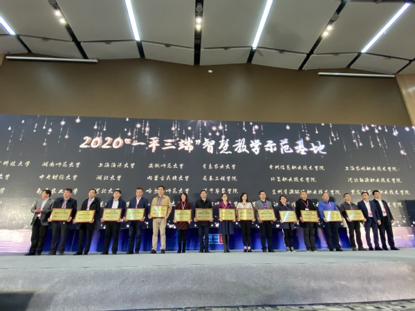 论坛举行了“一平三端”成果展示和授牌仪式。我校与四川大学、武汉大学、吉林大学、大连理工大学等33所高校,被授予首批“一平三端智慧教学示范基地”,教务处副处长周燕华代表学校参加授牌仪式。