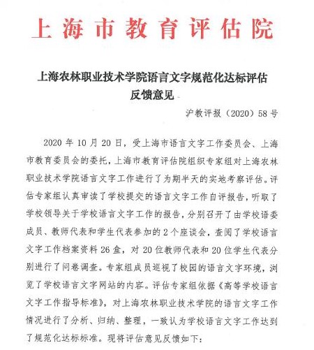 近日,上海市教育评估院公布了学院语言文字规范化达标评估的结果,评估专家组依据《高等学院语言文字工作指导标准》,对学院的语言文字工作情况进行了分析、归纳、整理,一致认为学院语言文字工作达到了规范化达标标准。