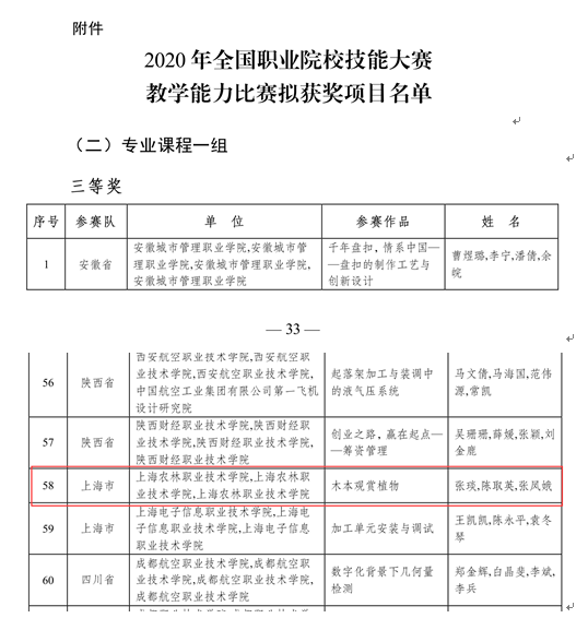 12月13-22日,教育部职业教育与成人教育司公示了2020年全国职业院校技能大赛教学能力比赛拟获奖项目,我院张琰、陈取英、张凤娥参赛团队荣获高职组专业课程一组三等奖。据悉,2020年全国职业院校技能大赛教学能力比赛现场决赛于12月10日至12日在株洲举办,比赛分为中等职业教育组、高等职业教育组和军事职业组,共收到来自地方37个代表队和军事职业组的985件参赛作品。经网络初评和现场决赛,中职组、高职组共产生一等奖82个,二等奖185个,三等奖258个。