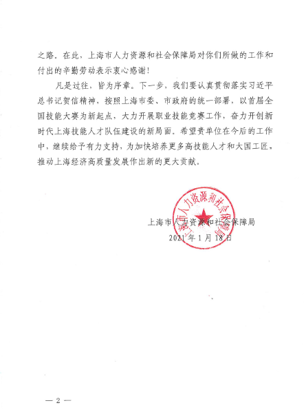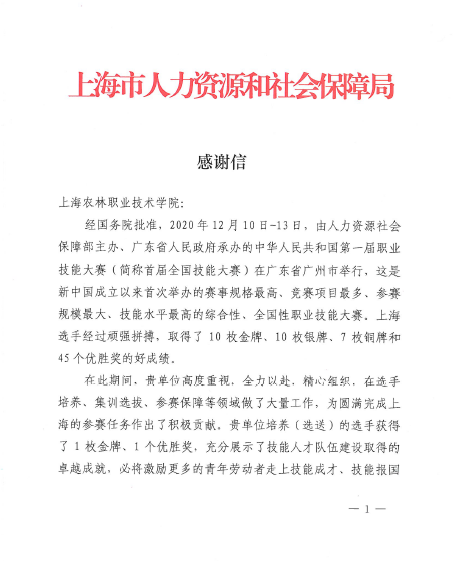 近日,学院收到了一封来自上海市人力资源和社会保障局关于首届全国技能大赛的感谢信。信中表达了对我院高度重视参赛选手技能培养工作的感谢。
