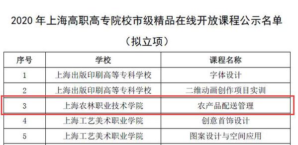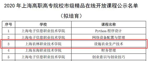 日前,市教委发布的《2020年度上海高职高专院校市级精品在线开放课程、教师教学创新团队拟立项和拟培育名单网上公示》中,《农产品配送管理》课程和环境工程技术专业教学创新团队分别获批2020年度上海高职高专院校市级精品在线开放课程和教师教学创新团队立项。《设施农业生产技术》和科技兴农创新基地教师教学创新团队课程分别获批2020年度上海高职高专院校市级精品在线开放课程和教师教学创新团队培育。目前,学院共有市级及以上精品课程19门,市级教学团队12个。