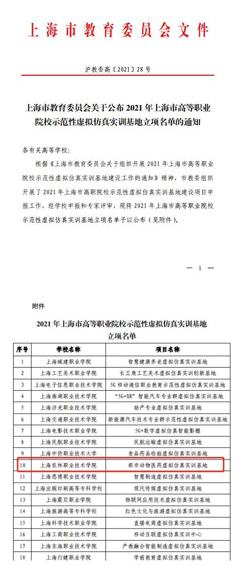近日,上海市教育委员会公布 2021 年上海市高等职业院校示范性虚拟仿真实训基地立项名单的通知,我院都市动物医药虚拟仿真实训基地项目审核通过,予以立项。