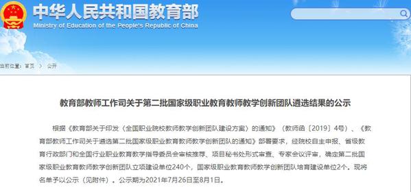 2021年7月26日,教育部确定第二批国家级职业教育教师教学创新团队立项建设单位名单。学院药品生物技术专业教师团队成功入选。