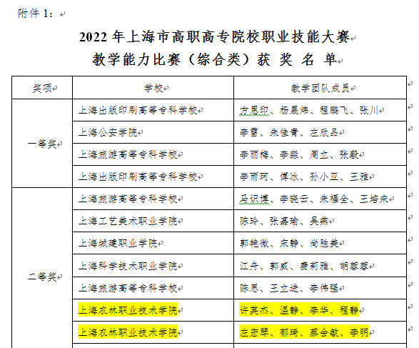5月4-11日,上海市高职高专院校职业技能大赛教学能力比赛(综合类)组委会公示了比赛结果,我院许英杰教学团队、左宏琴教学团队参赛,均荣获二等奖。此次比赛共有40支团队参赛,评选出一等奖4支团队,二等奖8支团队,三等奖12支团队,其余为优胜奖。