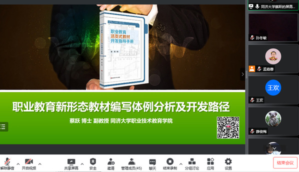 为进一步推动学院教材建设工作,5月11日,教务处邀请同济大学职业技术教育学院蔡跃博士、副教授开展了《职业教育新形态教材编写体例分析及开发路径》线上主题讲座,学院副院长张江,教务处、专业负责人及承担教材建设任务的教师共计50余人参加了本次活动。活动由教务处处长王欢主持。