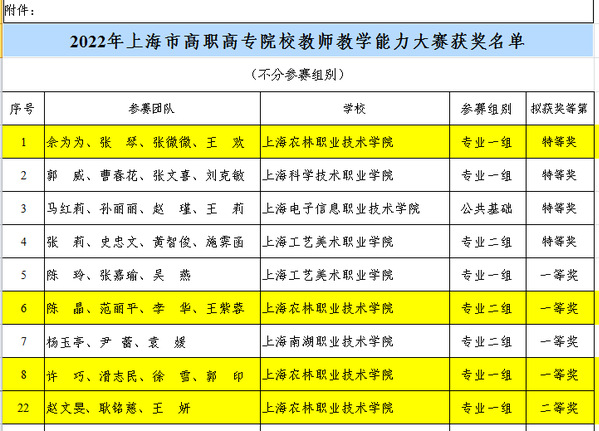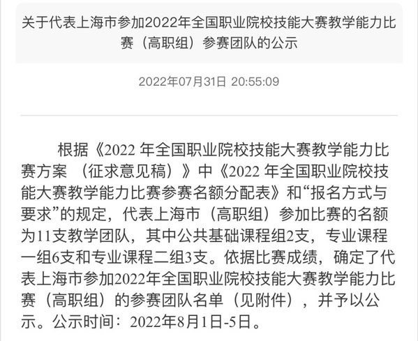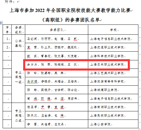 2022年全国职业院校技能大赛教学能力比赛上海市选拔赛组委会于8月1日-5日公示了代表上海市参加2022年全国职业院校技能大赛教学能力比赛(高职组)的参赛队名单,我校佘为为、张琴、张微微、王欢教学团队获得参赛资格。