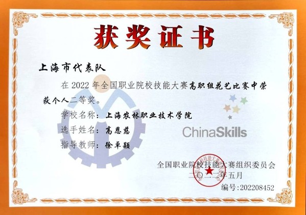 2022年8月21日至27日,2022年全国职业院校技能大赛高职组花艺赛项在湖北生态工程职业技术学院举行,共有全国28个省市、54支不同院校的代表队的选手同台竞技。植科系学生高恩慈在此次全国大赛中突出重围,最终荣获二等奖。