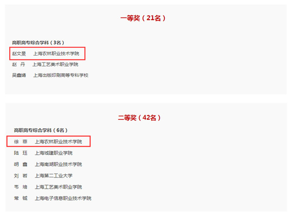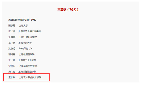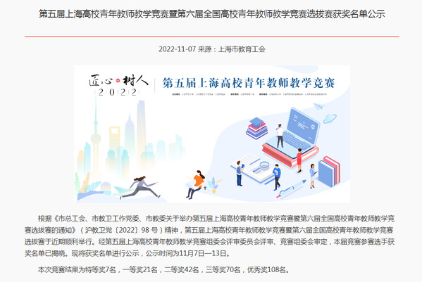 11月7-13日,上海市教育工会公示了第五届上海高校青年教师教学竞赛暨第六届全国高校青年教师教学竞赛选拔赛获奖名单,我院三名教师获奖,其中,智工系赵文旻老师荣获高职高专综合学科一等奖,植科系徐菲老师荣获高职高专综合学科二等奖、马院王欢欢老师荣获思想政治理论课专项三等奖。