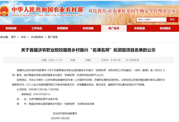 服务乡村振兴“名课名师”项目为农业农村部科技教育司面向全国涉农职业教育院校及培训机构组织开展,旨在引导涉农职业院校面向乡村振兴需求培养人才,及时宣传推介乡村振兴人才培养工作中涌现出的名课名师典范,遴选出的“名课名师”将由中华农业科教基金会进行资助。
