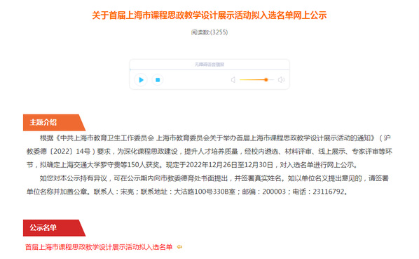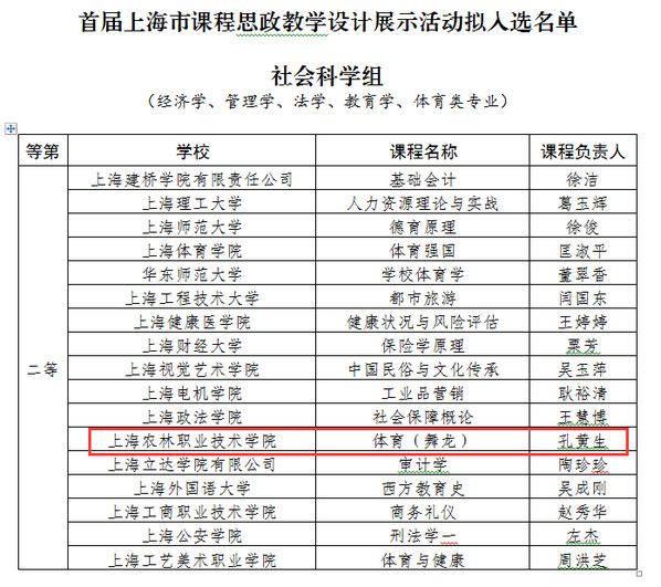 日前,上海市教委公示了首届上海市课程思政教学设计展示活动拟入选名单,学院3名教师获奖,其中,张琰老师荣获职业院校综合专业组特等奖,李林老师荣获职业院校综合专业组一等奖,孔黄生老师荣获社会科学组二等奖。