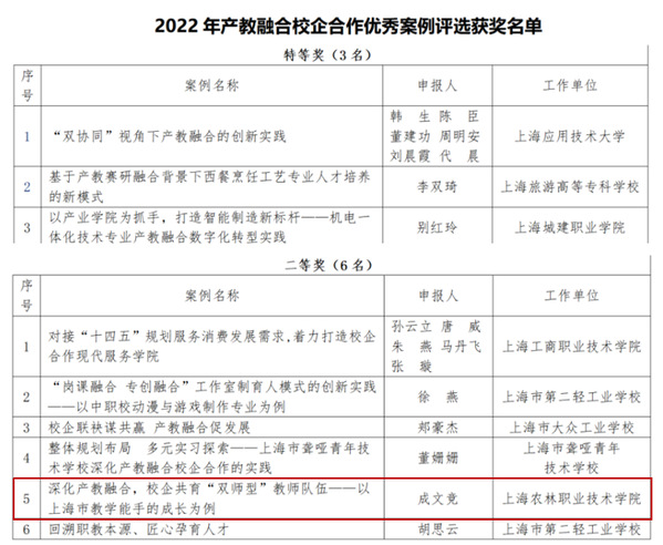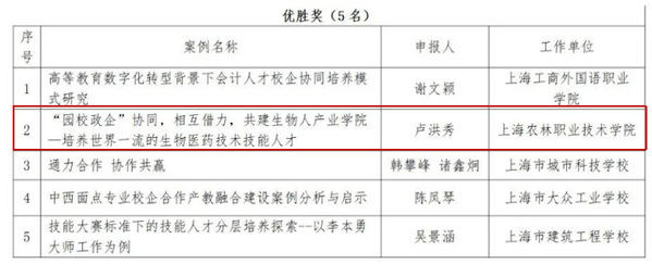 为深入贯彻习近平总书记对职业教育的重要指示和全国职业教育大会精神,深化产教融合、校企合作,推进落实《职业教育提质培优行动计划(2020-2023年)》,上海市教育委员会教育技术装备中心、上海市职业教育产教融合促进会联合组织了2022年产教融合校企合作优秀案例评选工作。经积极申报、专家评审,我校两个案例成功入选2022年产教融合校企合作优秀案例,其中成文竞老师撰写的《深化产教融合,校企共育“双师型”教师队伍——以上海市教学能手的成长为例》荣获二等奖,卢洪秀老师撰写的《“园校政企”协同,相互借力,共建生物人产业学院—培养世界一流的生物医药技术技能人才》荣获优胜奖。