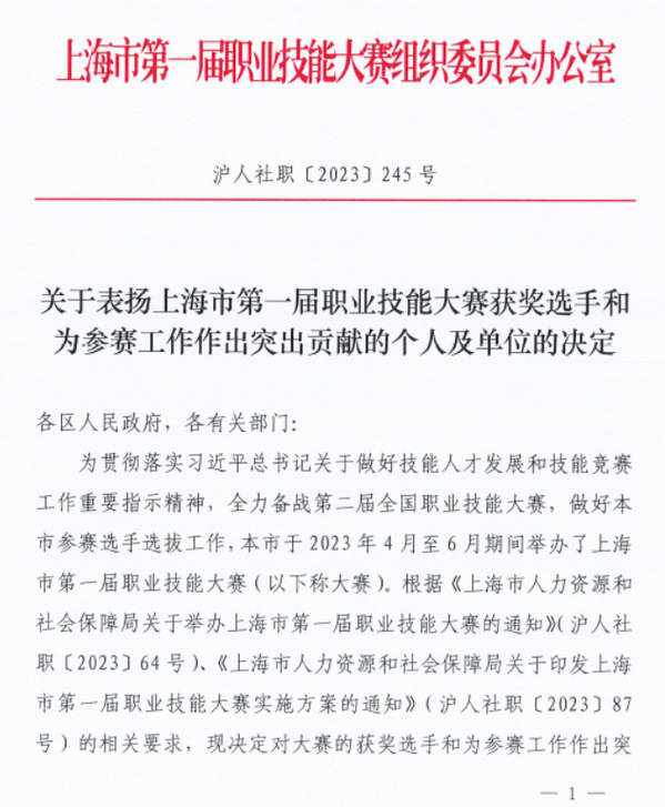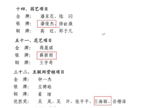 8月2日,上海市第一届职业技能大赛组织委员会办公室公布了《关于表扬上海市第一届职业技能大赛获奖选手和为参赛工作作出突出贡献的个人及单位的决定》(沪人社职〔2023〕245号),学院植科系学生潘俊杰、薛新雨分别荣获世赛项目——园艺、花艺项目银奖,学院创意系王海丽老师荣获国赛项目——互联网营销项目优胜奖。