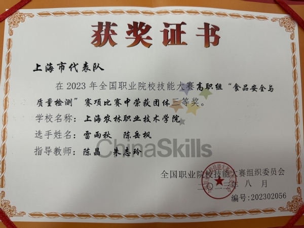 本赛项为团体赛,比赛总时长达9小时,共设置三个模块,分别是“食品安全专业知识测试(60分钟)”“食品微生物检验技能考核(180分钟)”“食品理化分析技能考核(270分钟)”。比赛既考察了食品安全质量控制、合规管理、法律法规、仪器分析等理论知识,又考察了菌落总数测定、细菌染色鉴别、三聚氰胺检测等共计7项技能实操,将食品质量安全热点问题与高职院校实践育人理念有效结合,理论知识考察细致、考核项目广泛、整体难度大。我院参赛学生雷雨秋和陈岳枫,凭借良好的心理素质和过硬的专业本领,有条不紊,沉着应战,最终取得了三等奖的好成绩,展示了我院学生扎实的专业技能和职业素养。