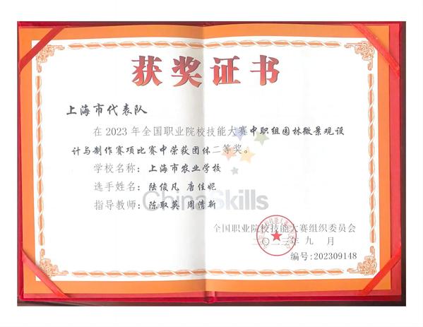 9月1日-4日,2023年全国职业院校技能大赛(中职组)“园林微景观设计与制作”赛项在安徽省池州职业技术学院举行,来自全国31个省(自治区、直辖市)的55支代表队110位选手同台竞技。经过激烈角逐,学校植科系园林(中高贯通)202班陆俊凡、园林(中高贯通)201班唐佳妮荣获团体二等奖。