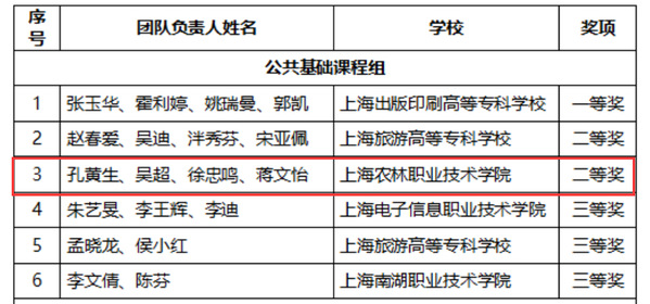 10月25日,上海高职公布了2023年上海市高职高专院校教师教学能力大赛获奖团队名单,共计30个团队上榜,其中,学院参赛的5支教学团队均获奖,分别是:朱新颖教学团队荣获专业课程组一等奖,孔黄生教学团队荣获公共基础课程组二等奖,左宏琴教学团队荣获专业课程组二等奖,李何君教学团队、赵文旻教学团队分别荣获专业课程组三等奖。