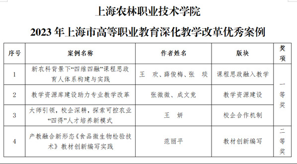近日,上海市职业教育协会高职高专教学工作专业委员会/上海市高职高专教学研究会公布了2023年上海市高等职业教育深化教学改革优秀案例评选结果,我校送评的4个案例全部获奖,其中一等奖3项,二等奖1项。