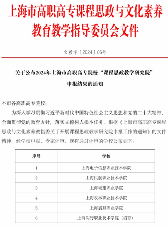 近日,上海市高职高专课程思政与文化素养教指委公布了2024年上海市高职高专院校“课程思政教学研究院”申报结果(文教字〔2024〕05号),学院课程思政教学研究院成功入选。