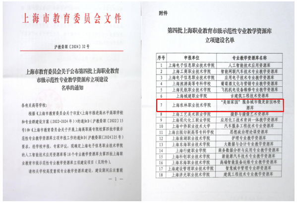 据悉,根据《上海市教育委员会关于印发<上海市推进高水平高职学校和专业群建设方案(2022-2024年)>的通知》(沪教委职〔2022〕15号)和《上海市教育委员会关于开展上海高职高专院校第四批市级示范性专业教学资源库立项申报工作的通知》(沪教委职〔2024〕25号)要求,学院积极组织申报、经市教委组织专家评议,学院申报的“美丽家园”服务城市微更新园林资源库被立项为示范性专业教学资源库。目前,学院共有园艺技术、设施农业与装备、动物医学、“美丽家园”服务城市微更新园林资源库四个市级示范性专业教学资源库。