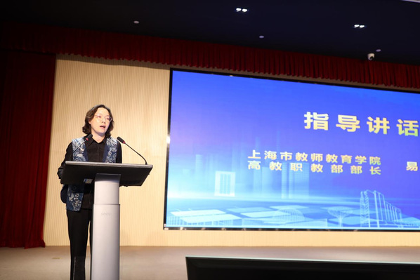 易萍做指导讲话时,介绍了教师教育学院新成立的高教职教教师部的情况,她感谢教指委在专业课程方面为上海职教做出的贡献,后续也希望各教指委继续支持,同时希望参会的教师学有所思、学有所获。