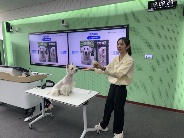 动物科学技术系黄小乘老师主讲《宠物心理与行为》公开课,进行40分钟的有生课堂教学、10分钟的现场说课。黄老师首先通过讲解犬在不同情绪状态下的肢体表现,帮助学生理解犬如何通过身体姿态、尾巴变化、耳朵位置、嘴部表现等细节传达情感和意图;结合实际案例,如犬在社交、训练和生活场景中的行为表现,让学生深刻理解犬的肢体语言如何反映其内心状态。为了使知识更加直观化,课堂还结合了多媒体资源和助教小狗的现场展示,通过真实情境让学生观察犬的肢体语言特征,并通过案例分析引导学生理解如何判断犬的情绪和行为目的,充分展现了扎实的专业功底和教学创新能力