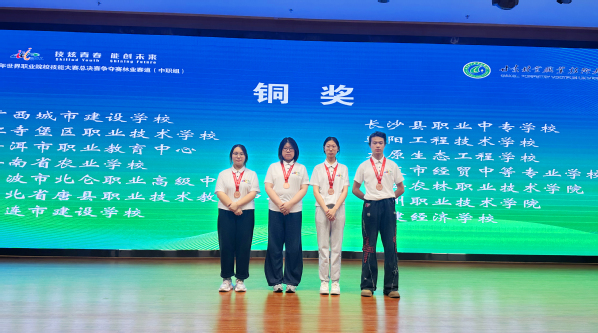 8月20日至23日,2025年世界职业院校技能大赛总决赛争夺赛林业赛道(中职组)在甘肃林业职业技术大学成功举办。来自全国54所中职院校的215名选手齐聚赛场、激烈角逐。由我院植物科学技术系园林技术专业(五年一贯)231班蔡汪亦、232班李诗涵、季成杰以及241班刘妙同学组成的参赛团队表现优异,最终荣获铜奖。