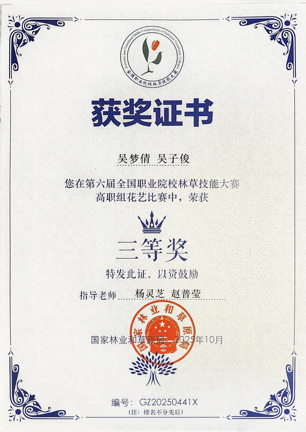10月27日至29日,第六届全国职业院校林草技能大赛花艺(高职组)赛项在湖北生态工程职业技术学院隆重举行。来自全国高职院校的53支代表队、106名选手齐聚一堂,展开激烈角逐。我院植物科学技术系学生吴梦倩、吴子俊组成的参赛团队凭借扎实的专业功底和出色的创意表现,最终荣获三等奖