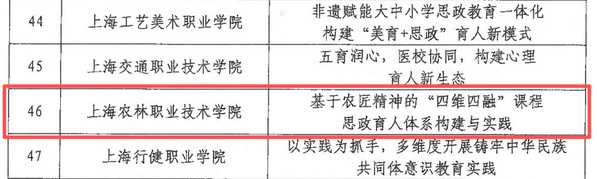 近日,上海市教卫工作党委、市教委印发《关于公布2025年上海市立德树人机制综合改革试点典型工作案例入选名单的通知》(沪教卫党〔2025〕237号),学院申报的《基于农匠精神的“四维四融”课程思政育人体系构建与实践》案例,经单位推荐和市级评审,从全市众多优秀案例中脱颖而出,成功入选2025年上海市立德树人机制综合改革试点典型工作案例,跻身全市百项典型案例行列。